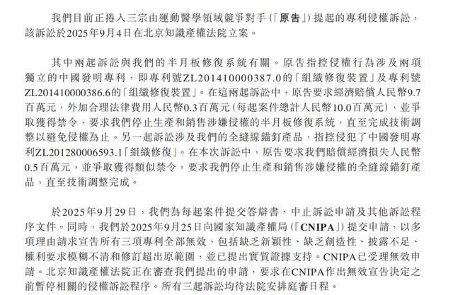 招股书披露,就在2025年9月,即公司筹备转战港股的关键期,一家运动医学领域的竞争对手向北京知识产权法院提起了3起专利侵权诉讼。