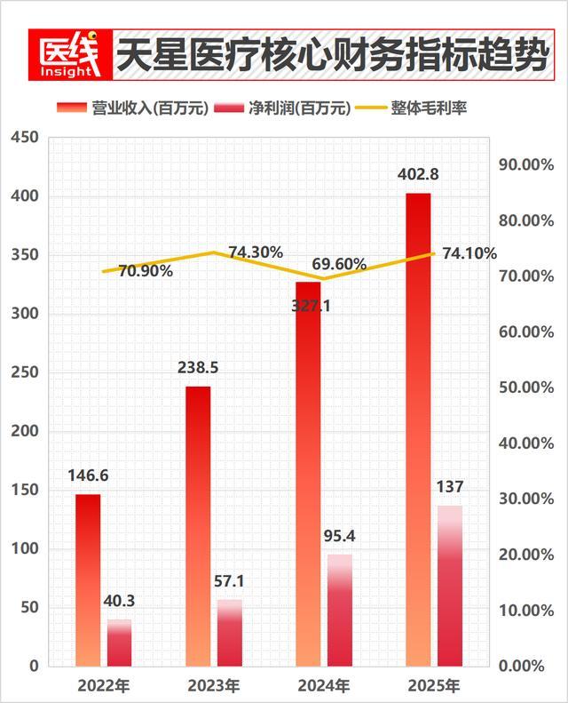 据招股书,2022年至2025年,天星医疗的营业收入分别为1.47亿、2.39亿、3.27亿和4.03亿元;净利润更是连年上涨,分别为4034万、5711万、9539万和1.37亿元。