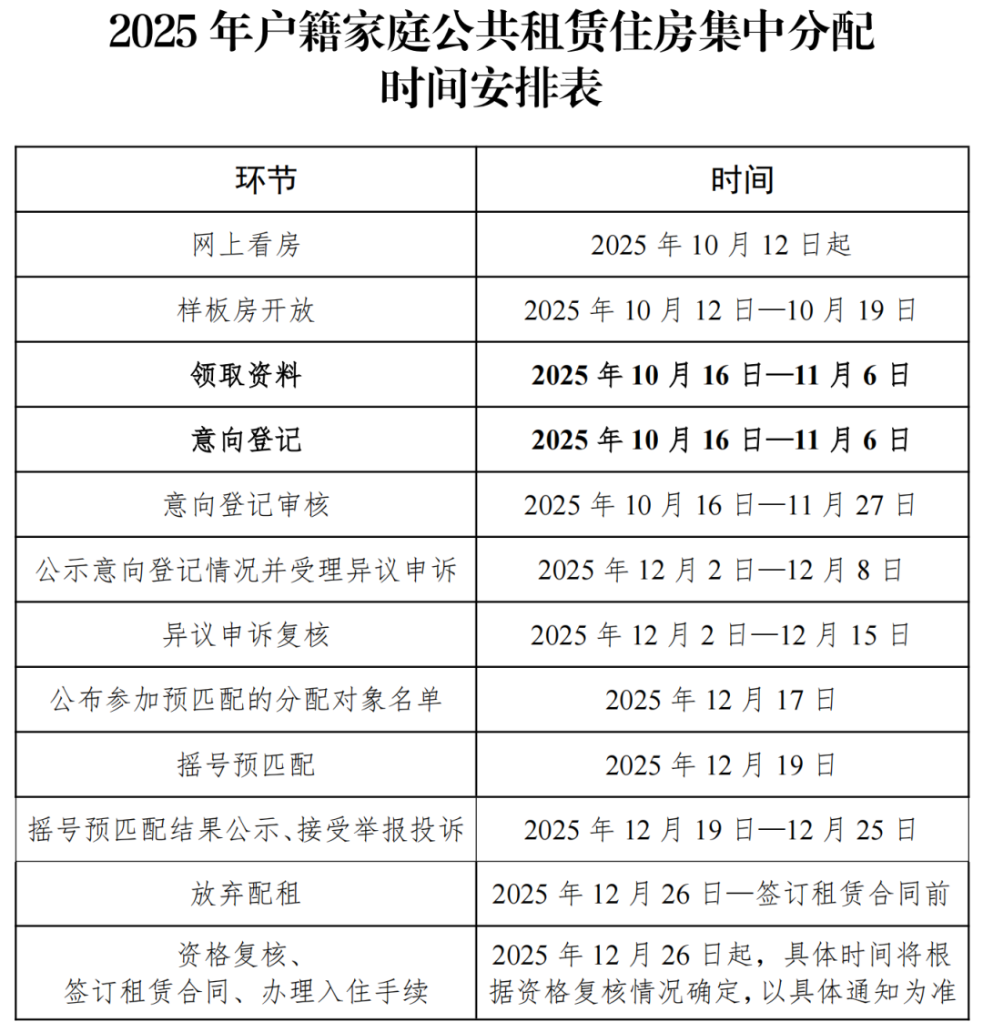 据相关日程安排,今年户籍家庭公租房将于2025年10月16日至11月6日接受符合申请公共租赁住房条件的轮候家庭意向登记,12月19日公开进行摇号预匹配房屋。