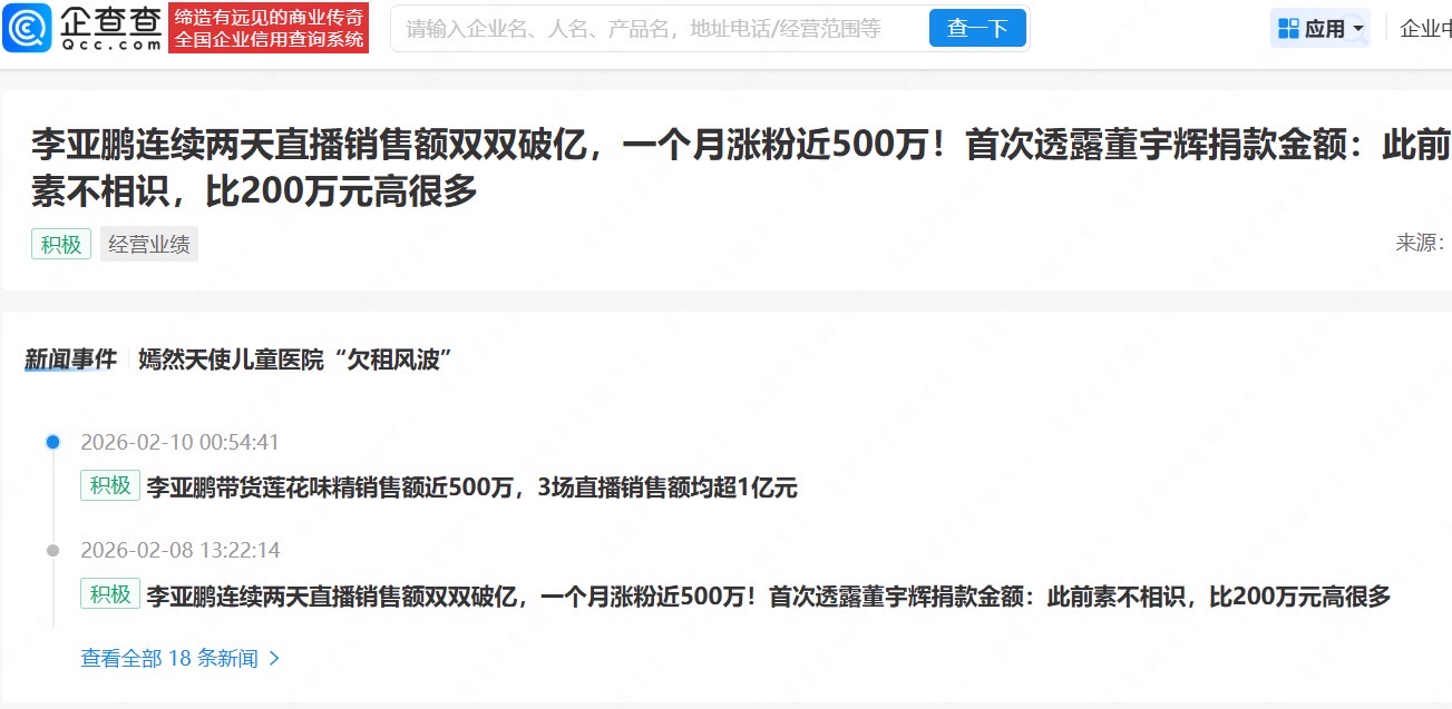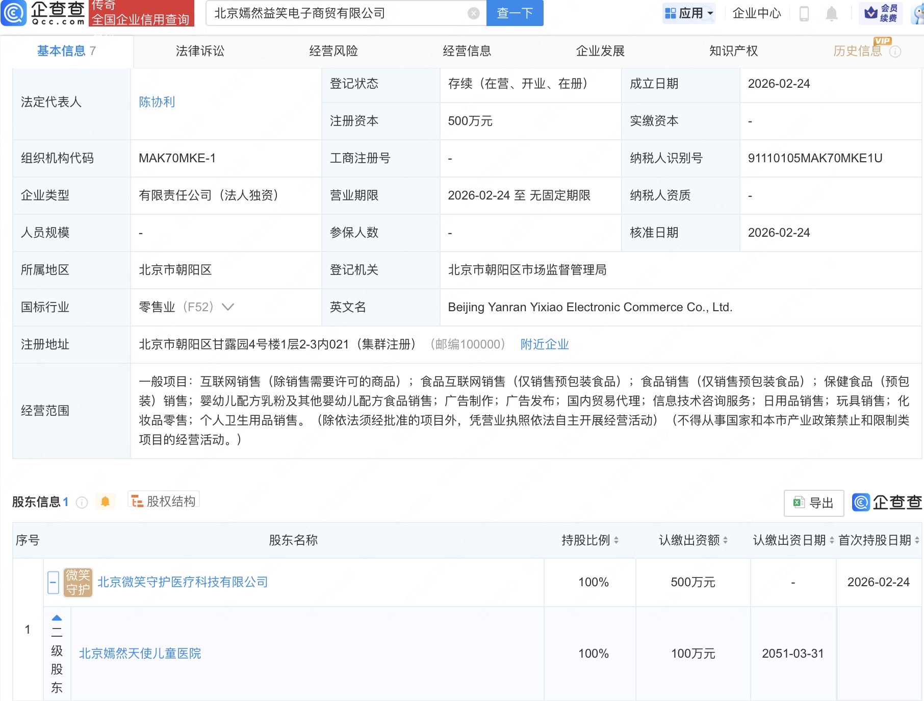 近日,北京嫣然益笑电子商贸有限公司成立,法定代表人为陈协利,注册资本500万元,经营范围含互联网销售、婴幼儿配方乳粉及其他婴幼儿配方食品销售等,由北京嫣然天使儿童医院间接全资持股,后者法定代表人为李亚鹏。据悉,李亚鹏在2月6日和7日的直播中销售额均破亿,一个月涨粉近500万。