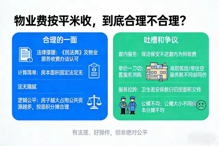 最近网上关于物业费的争论越来越激烈,很多人都在问:物业费按建筑面积收取,真的合理吗?有人搬出《民法典》,说按面积收费简单清晰,大房子占用更多公共资源,多交钱天经地义。可现实却让无数业主心寒:保洁保安只在公共区域工作,从不进入业主家中;高低楼层服务不同,却收一样的钱;房子长期空置没人住,物业费一分不少;物业服务大幅缩水、态度恶劣,照样照单全收。公摊面积怎么算、公共收益去哪了,更是一笔糊涂账。这套规则看似有法理支撑、方便操作,却从根本上违背了公平原则,也忽视了业主最真实的权益。